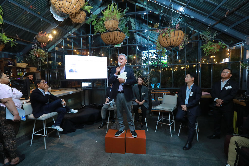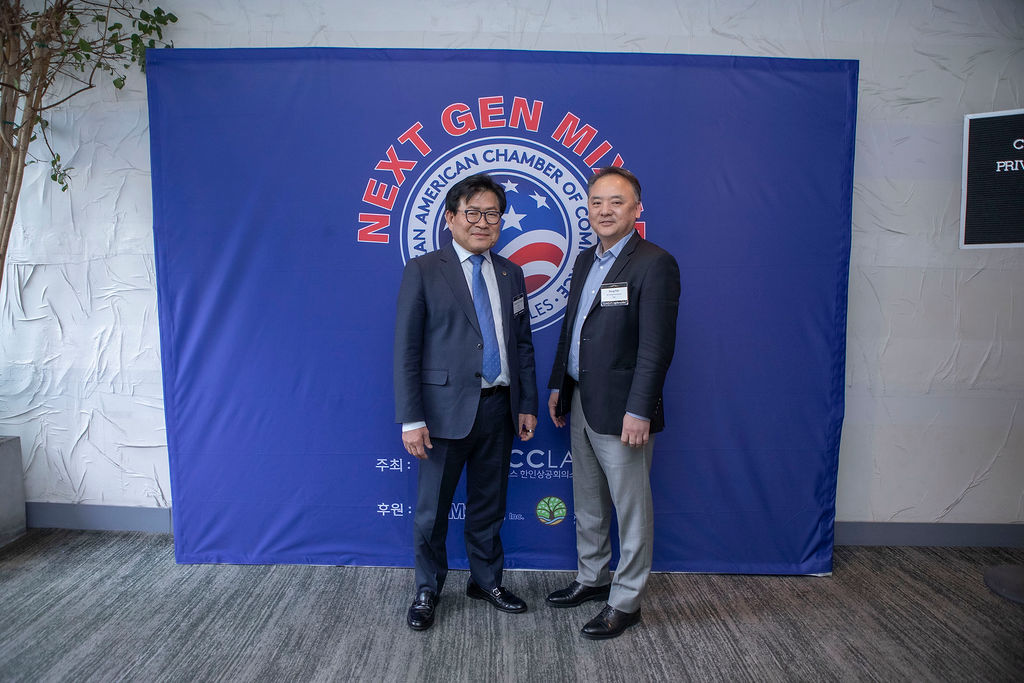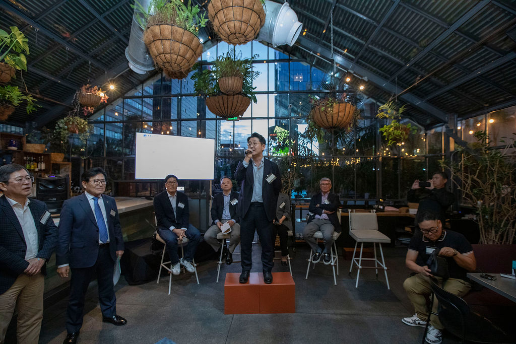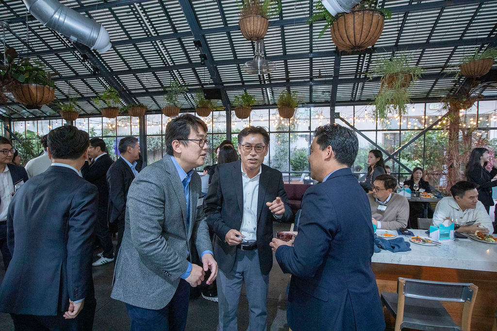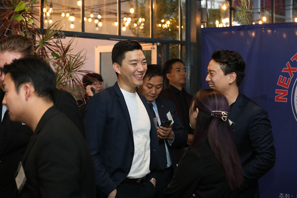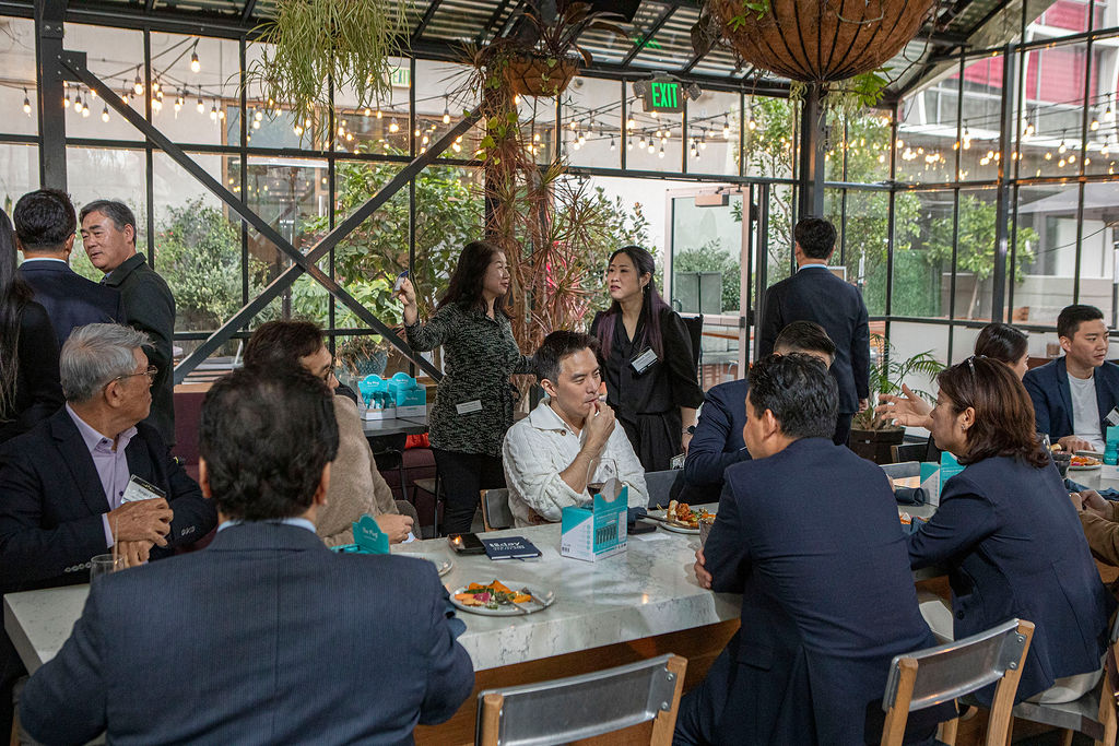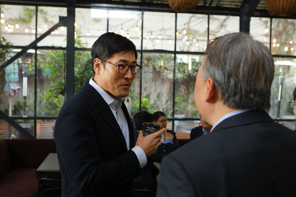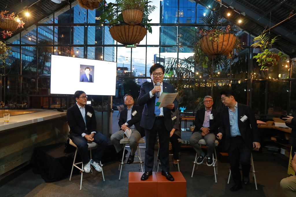 지난 27일 LA한인타운 라인호텔에서 열린 LA한인상의 주최 'NEXT GEN MIXER'에서 이용기 회장이 멘토로서 비즈니스 파트너십의 장단점에 대해 소개하고 있다. 참가자들이 네트워킹을 하고 있다. LA한인상의 정상봉 회장이 개막에 앞서 인사말을 하고 있다. 키노트 스피커들 믹서를 준비한 상의 이사들이 기념촬영을 했다. 왼쪽부터 CK KIM 대표, DOUG PAK 대표, 정상봉 회장, 류민지 팀장, 이용기 회장, LA한인상의의 션모 부회장, 알렉스 차 이사, 제이슨 송...