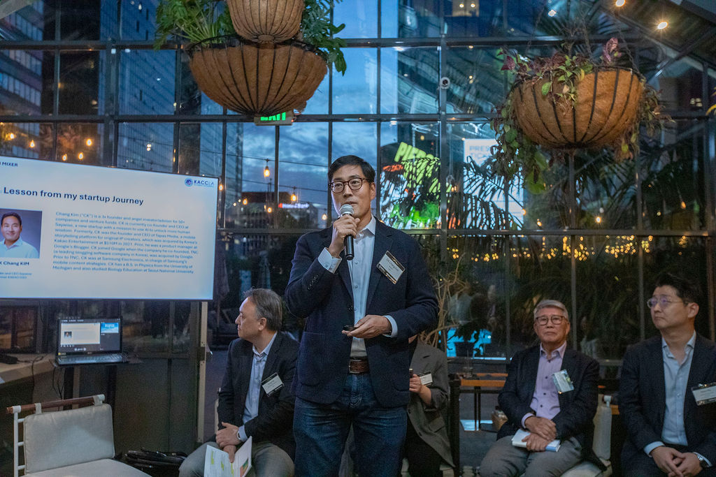 지난 27일 LA한인타운 라인호텔에서 열린 LA한인상의 주최 'NEXT GEN MIXER'에서 이용기 회장이 멘토로서 비즈니스 파트너십의 장단점에 대해 소개하고 있다. 참가자들이 네트워킹을 하고 있다. LA한인상의 정상봉 회장이 개막에 앞서 인사말을 하고 있다. 키노트 스피커들 믹서를 준비한 상의 이사들이 기념촬영을 했다. 왼쪽부터 CK KIM 대표,...